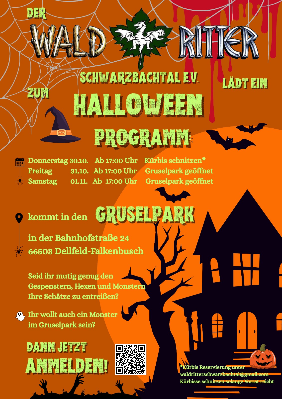 Es ist bald wieder Gruselzeit! Mit Kürbis-Schnitz-Workshop und gespenstischem Gruselpark. Besucher und Mitwirkende sind herzlich willkommen eine schaurig-schöne Zeit bei uns zu verbringen und süße (oder auch saure) Schätze den Klauen von dunklen Gestalten zu entreißen. Nur Mut, es wird niemand gefressen… höchstens ein wenig angeknabbert! Muahahahaha!!!!